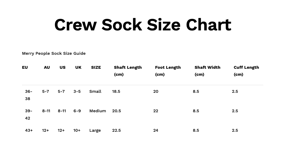 Refer to the size chart below to find your perfect fit in our Crew Socks: